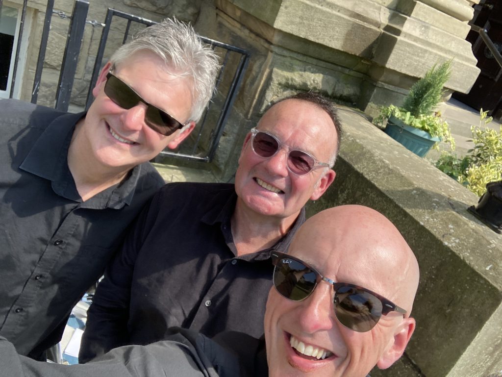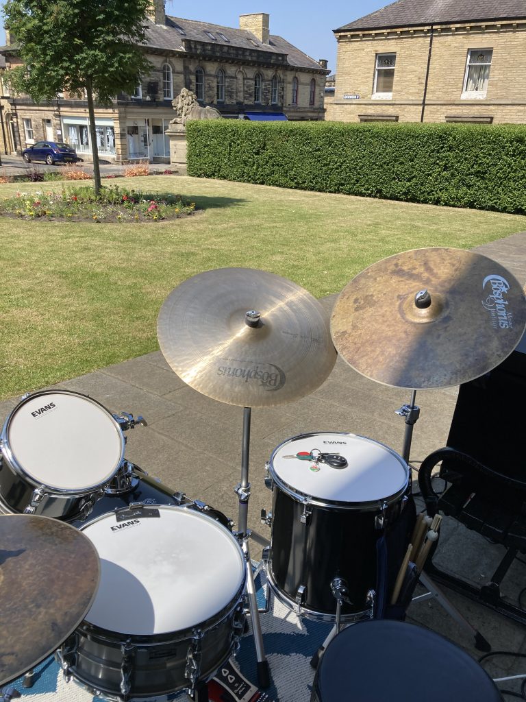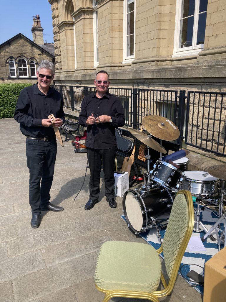 Saltaire is a Victorian model village in Shipley West Yorks. We were lucky enough to enjoy some spectacularly good weather last weekend, so we played in the open air for a wedding reception in what can only be described as a picture postcard location at the Victoria Hall.